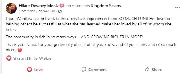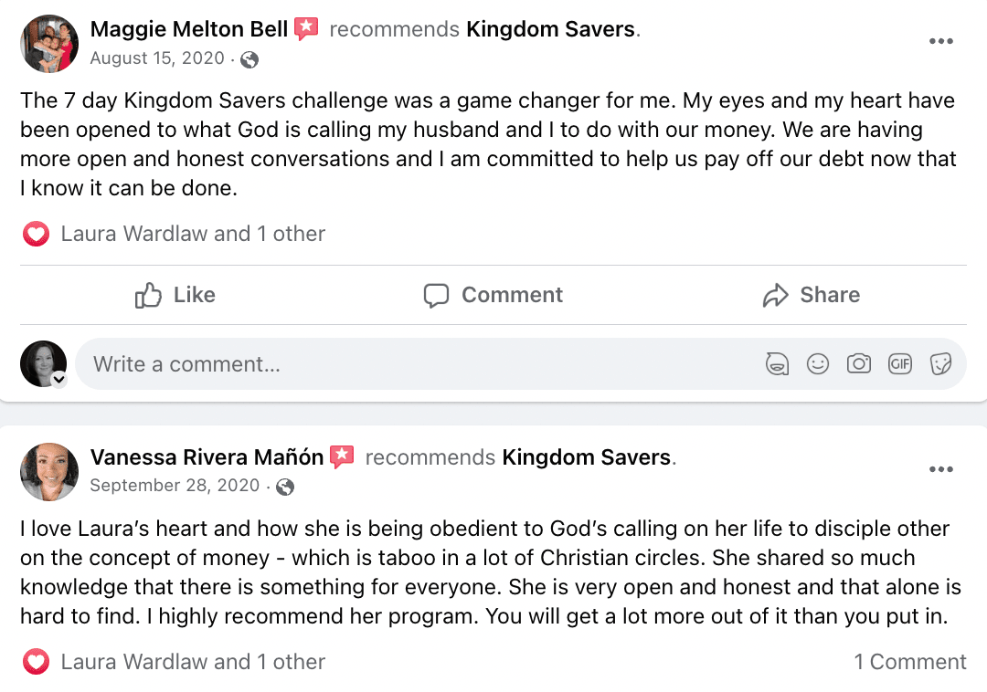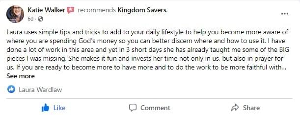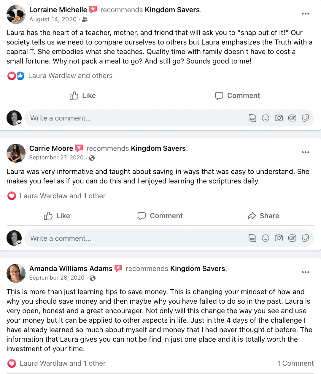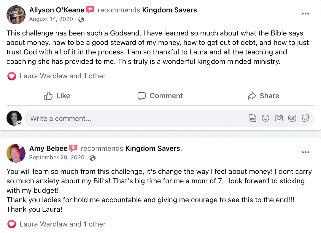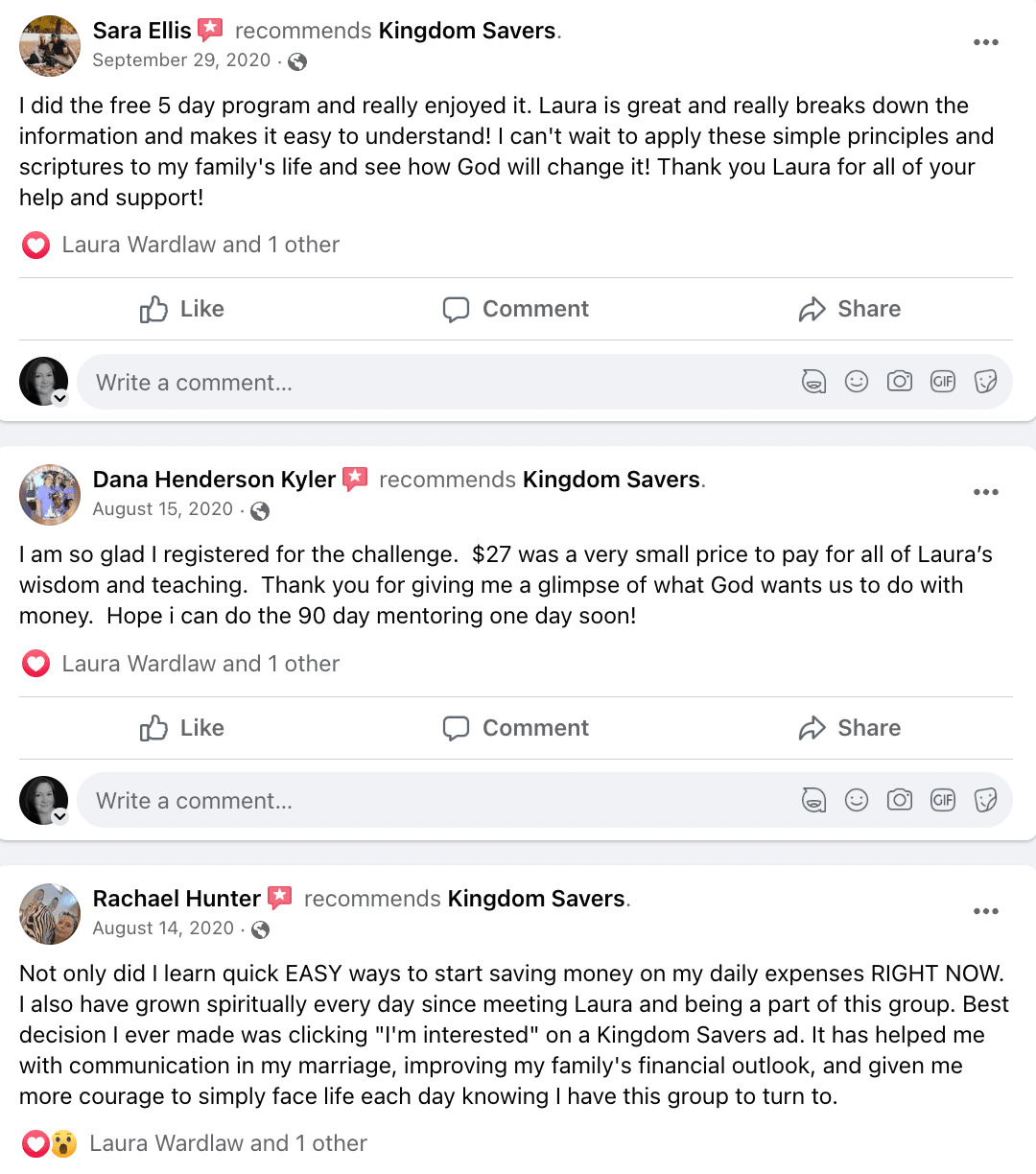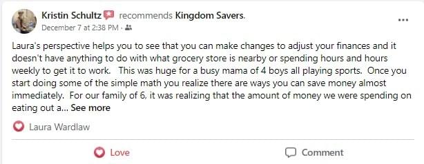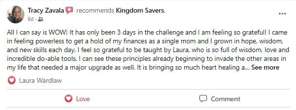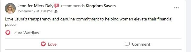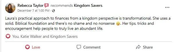 “Like most of you, I did not know who Laura was, I just saw an ad on Facebook and knew my finances needed a change. I took the leap and I got way more than I invested! Laura is a bold, yet sincere teacher when it comes to Scripture and Finances. She took it to a new level for me and gave practical application to apply it. For me, it was much more than I bargained for! If you are on the fence, jump on board with Laura and Kingdom Savers.”