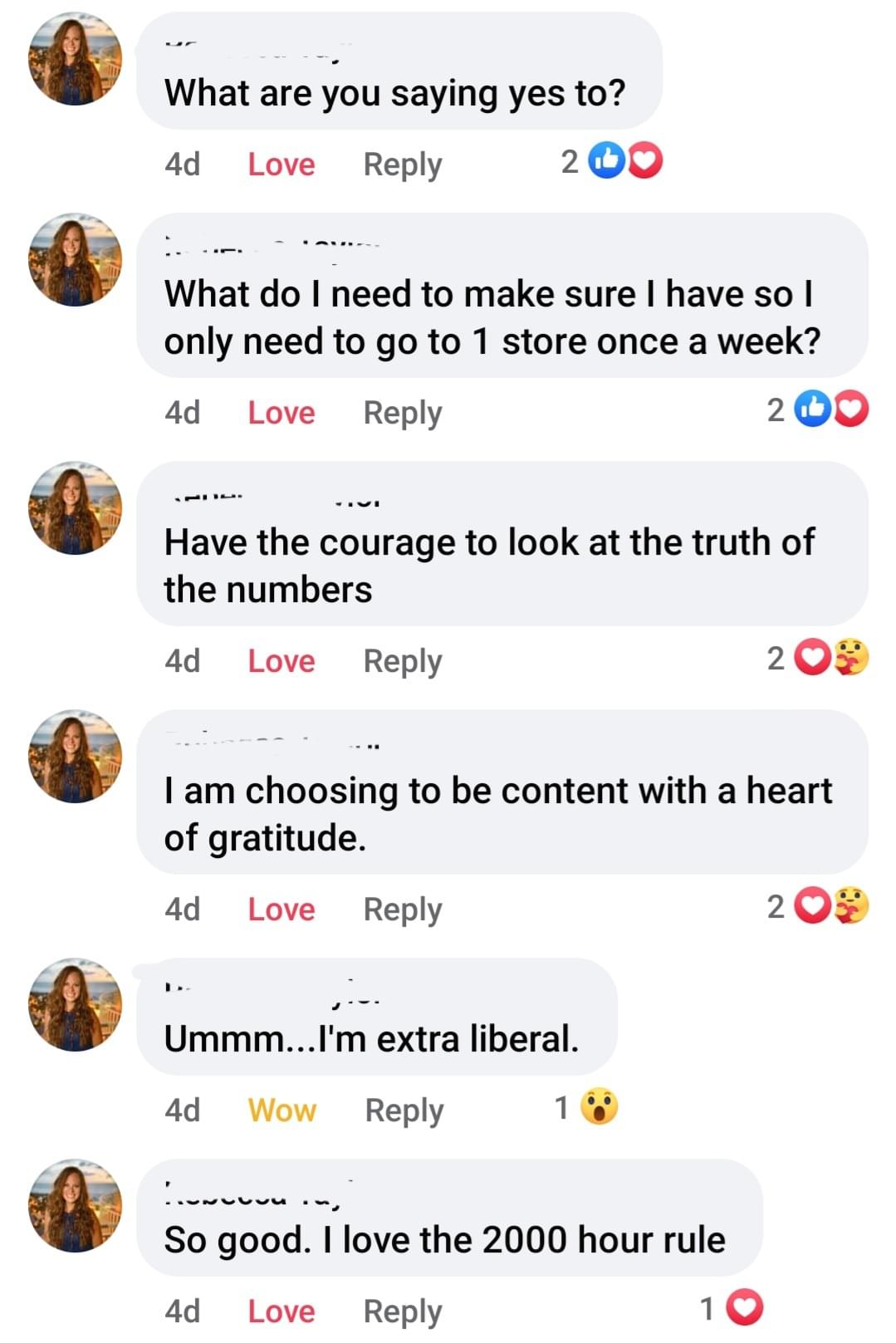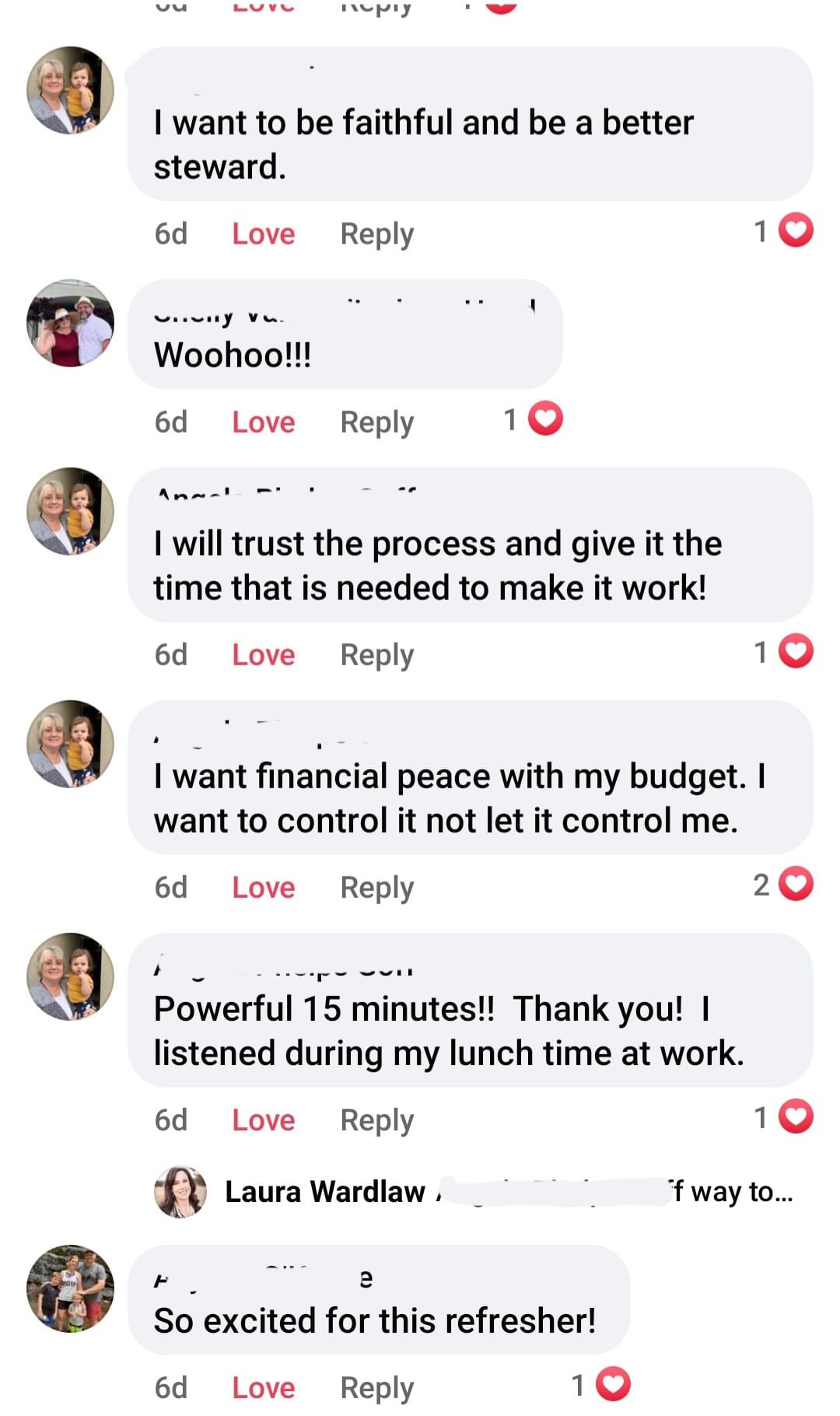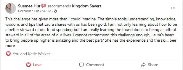 “Lots of eaters in our house!  I love that she's busting myths, she uses real life examples.  Her training is short and sweet. there's small daily steps you can take that only take 10-15 minutes to do.  Her training is very professional, yet very real and authentic, it's relatable and she's very involved and active in the group.  The most important thing is she adds scripture and prayer and isn't that the most important ingredient?  It's not just about the groceries!  If you're ready to have MORE, to do the work to be faithful with finances, this is the place to start!  ”