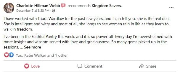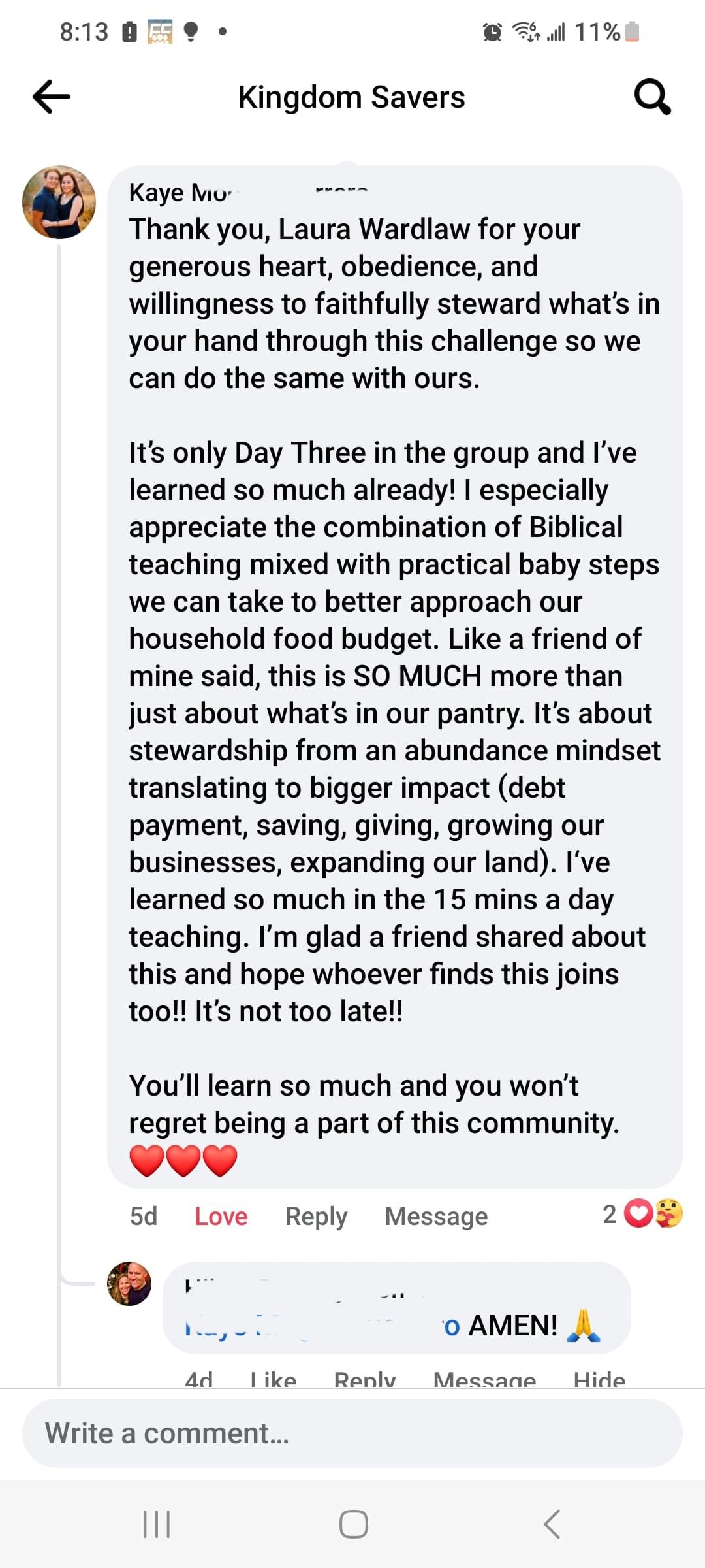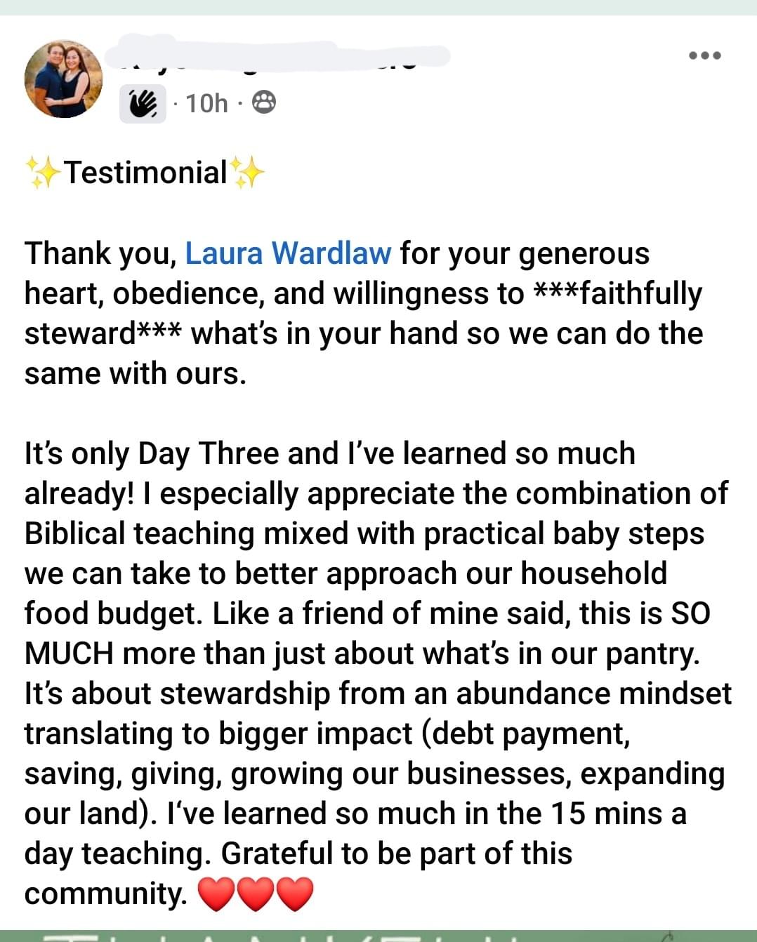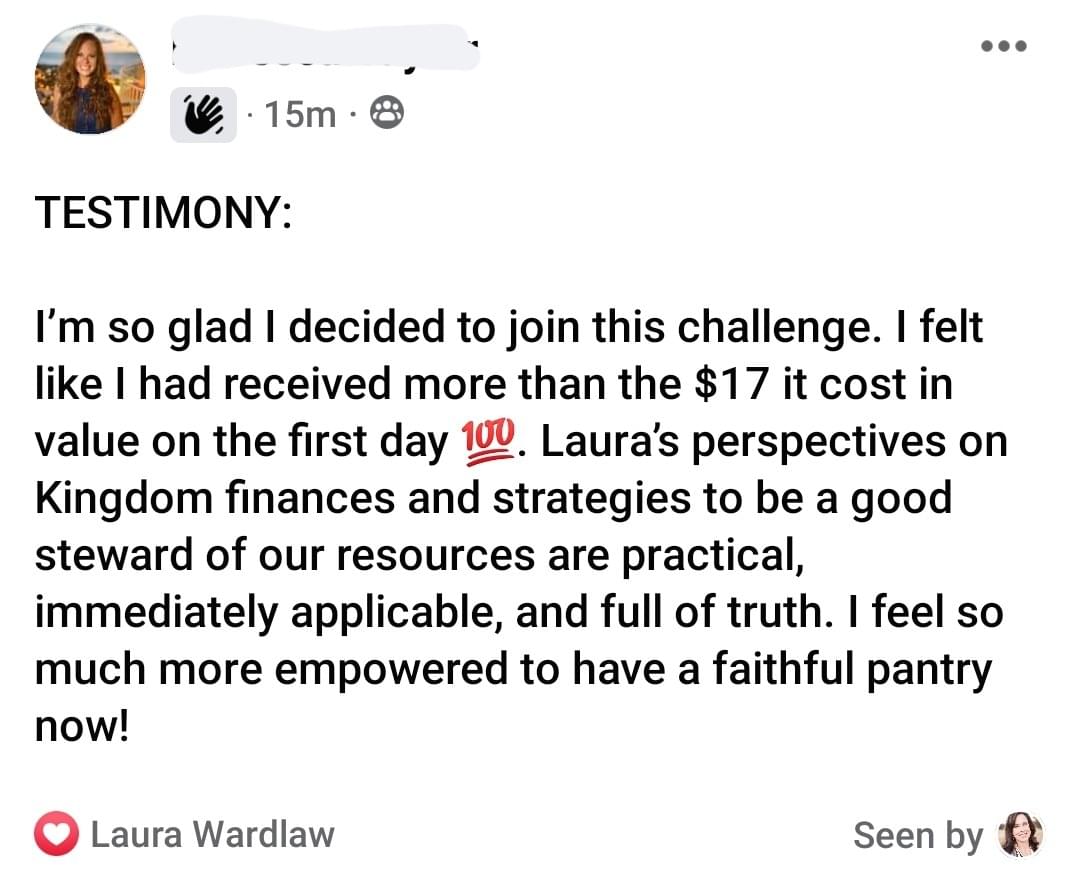 “If you're even thinking about paying the $17 to do The Faithful Pantry Challenge, just go ahead and do it! Laura and the community are so amazing. It's only been 3 days and I already feel so much more EQUIPPED, so much more EMPOWERED, and so much more SETTLED about how to move forward with my finances. Different strategies that I have never heard of before for managing my pantry and managing my grocery budget. Get in here and do it! It's so good! It's so worth it. So worth the investment of time and money.”