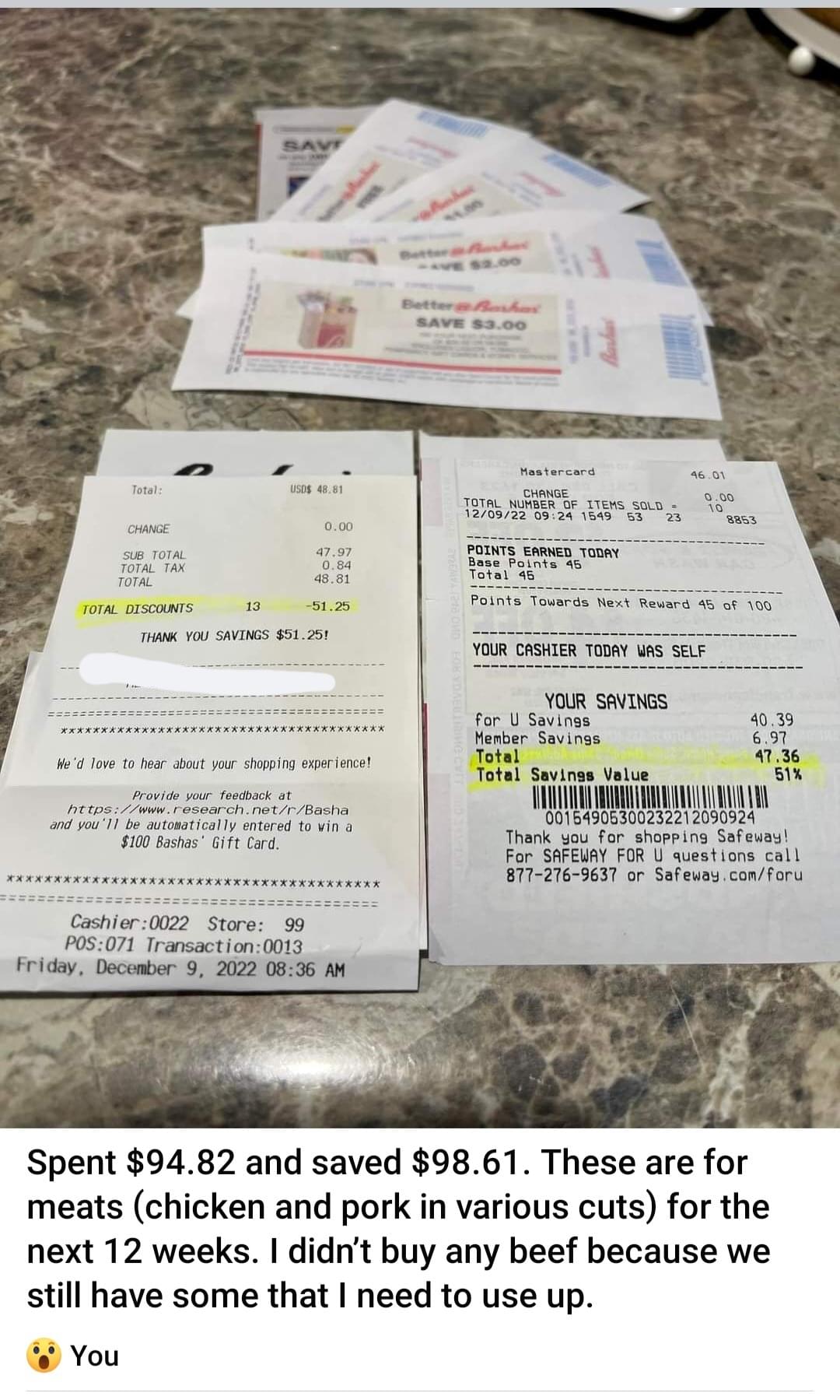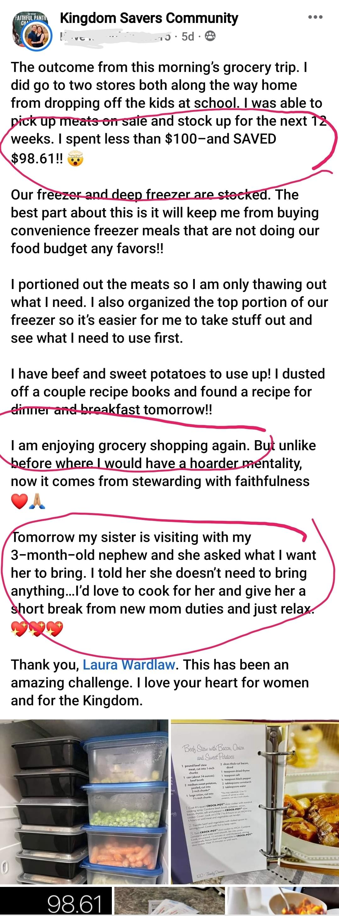 “I was so excited to share that I finally did it right! I walked out of the grocery store with a lot of groceries for $96! I have never walked out of a grocery store having spent less than like $150! Thank you, Laura, for being an encouragement today. I was so excited to go to the grocery store!”